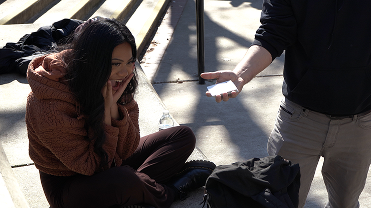 Tilskueren kan frit skære og blande kortene. Mens de gør det, beder du Siri om at nævne et tilfældigt kort og et tilfældigt tal. Uden at du nogensinde rører kortene, tæller tilskueren ned – og kortet ligger præcis på den position Siri har sagt.