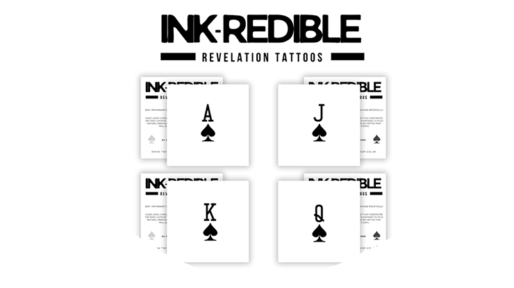 Disse banebrydende tatoveringer er skabt med en kemisk teknologi, der placerer blækket i hudens yderste lag. Resultatet? En hyperrealistisk tatovering, der er næsten umulig at skelne fra en ægte. Glem alt om de blanke, billige overføringsmærker – her får du en illusion, der holder. Brug én på din arm eller dit håndled, og lad publikum tro, at deres frit valgte (tvungne) kort er tatoveret på dig. Eller brug alle fire designs på forskellige steder som en genial multiple out-løsning.