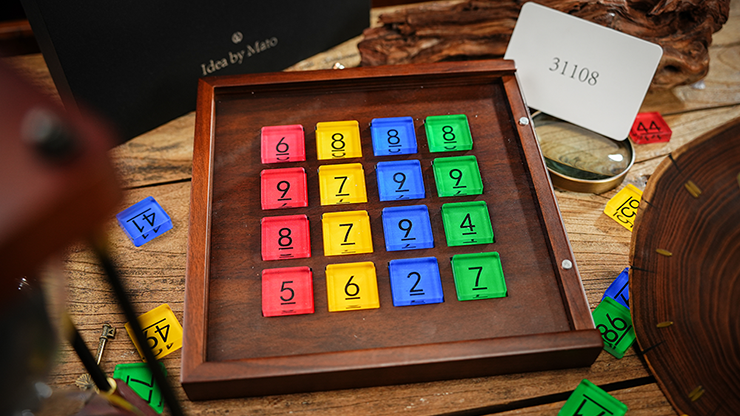 Sættet består af akryl-talsedler i høj kvalitet, et solidt displaybræt i valnød, forudsigelseskort, små kuverter og velourposer.