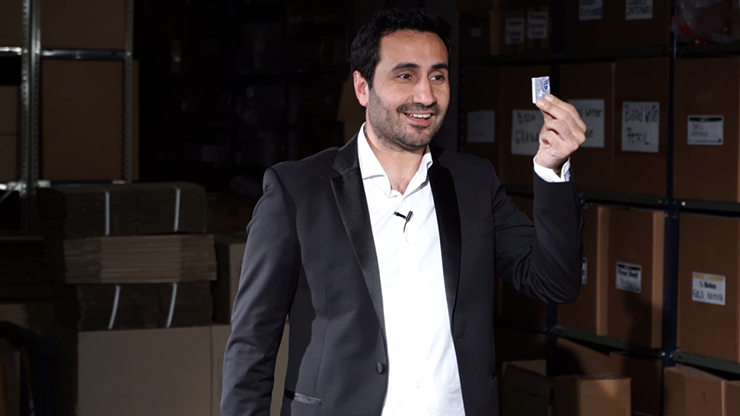 Han kaster kortene fra posen op i luften – og midt i kortregnen griber han ét foldet kort. Han folder det ud og viser, at det er præcis det kort, der blev nævnt!