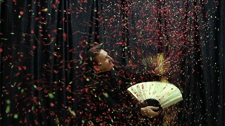 Du tager tre servietter, knuger dem sammen – og pludselig dukker en vifte op, mens servietterne forvandles til flerfarvet konfetti. Konfettien skifter farve i tre trin: først én farve, så en anden, og til sidst en tredje. Du kan også bruge to servietter – rød og grøn – til juleshows!