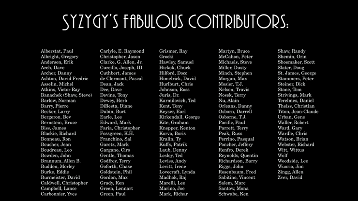 Fem hundrede otteogtyve sider i formatet 21,6 x 27,9 cm rummer over 270 komplette rutiner, hundredvis af fotos og illustrationer, interviews og professionel rådgivning fra verdens førende professionelle og amatør-performere. Præsentationerne spænder vidt – fra mental magi til solid og dybt virkningsfuld Mentalisme. Disse eksklusive sider rummer et himmelsk lineup af personligheder og materiale. En ægte SYZYGY.
